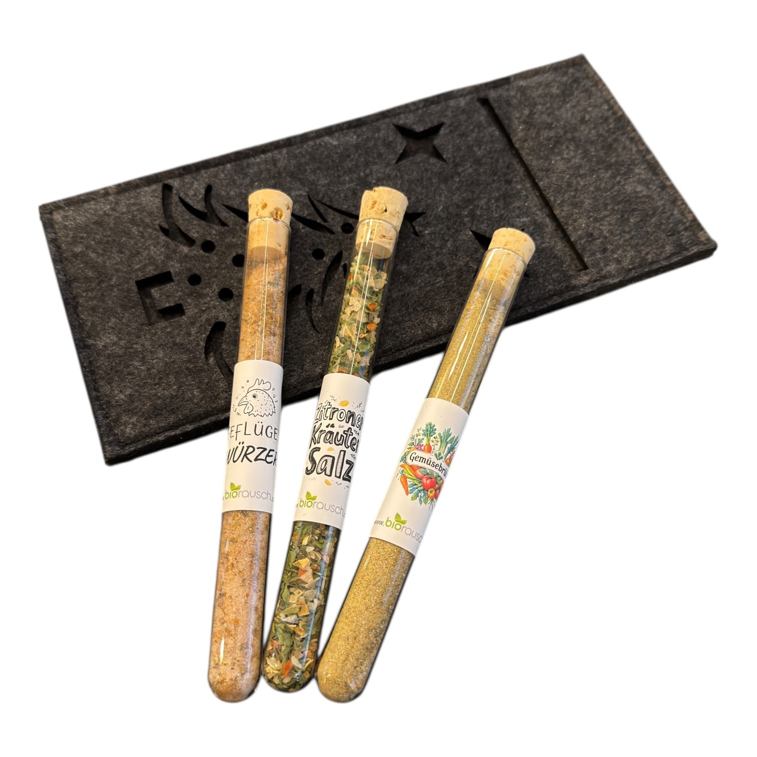 Eine Filz Tasche mit 3 Gewürzen gefüllt