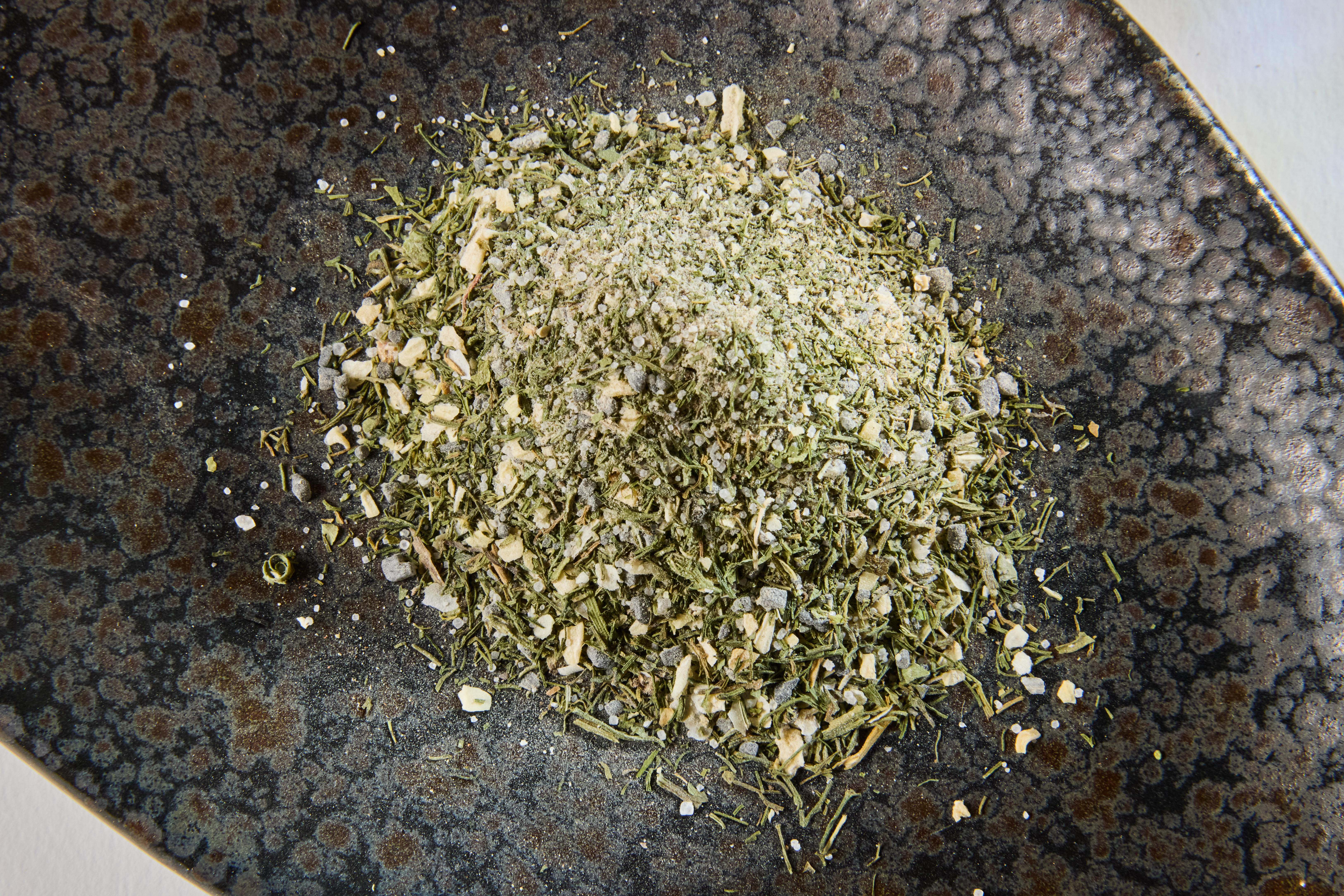 Hawaiianisches Lavasalz schwarz, Speisesalz, Erythrit E968 Dill, Zwiebel gekibbelt, Knoblauchpulver, Pfeffer