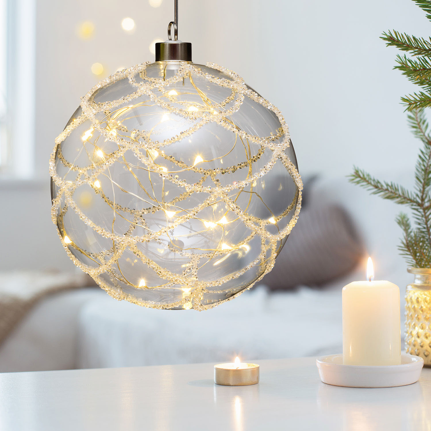 LED Glas Sphere Kugel mit Strass Steinen Silber 15 Cm - Timer + Fernbedienung